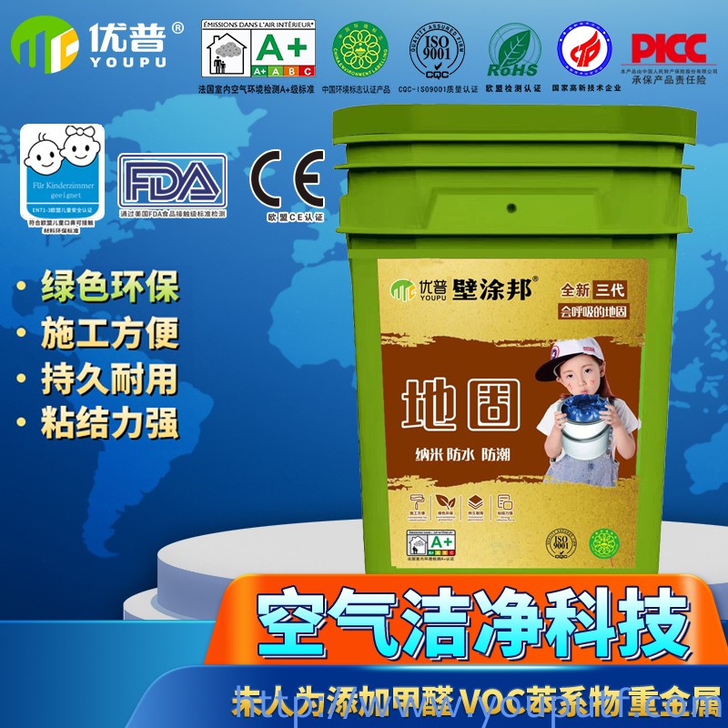 “優普壁涂邦納米防水防潮地固”是一種專門作用于水泥基面上的防水涂料。其采用進口高分子聚合物,經過多道工序復合而成,高分子聚合物能滲透水泥地面,牢牢封鎖水泥地面的松散顆粒,便于裝飾材料與地面緊密結合,保證了水泥地面的封閉處理,有效防止地磚的空鼓現象。優普壁涂邦地固耐水防潮,也可以避免木地板受潮氣侵蝕而產生的變形,同時避免日后從地板縫隙中“撲灰”。此產品不含甲醛等有害物質,是綠色環保產品,對人體無害。